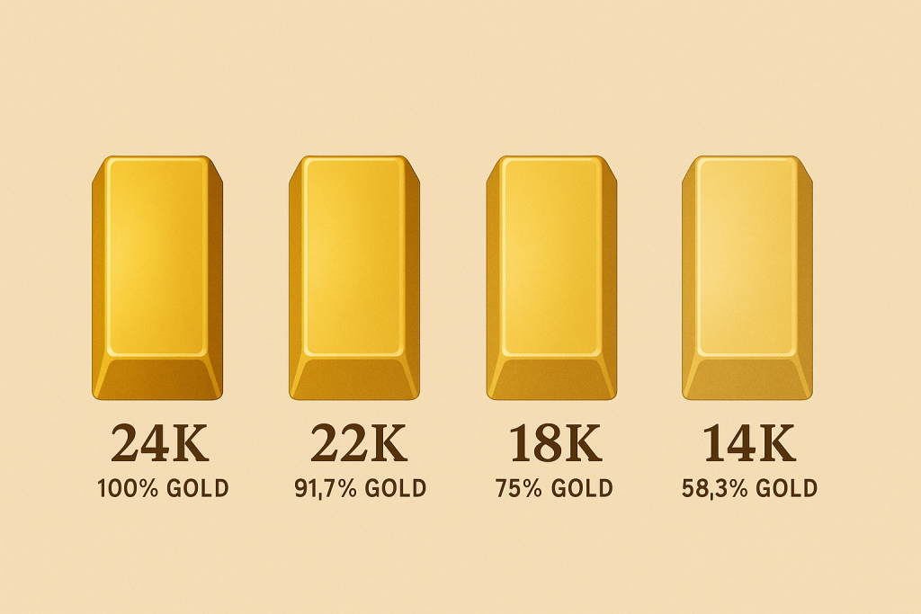 Karat (kt) is the standard unit used to express the purity of gold alloys. Pure gold is designated as 24k , indicating 99.9% purity. Gold of lesser karat values is alloyed with other metals such as silver, copper, or nickel to enhance strength and durability. For example, 18K gold contains 75% pure gold, while 14K gold consists of 58.3% pure gold. The karat rating directly influences the metal’s color, hardness, and market value, making it a critical factor in jewelry manufacturing and investment. Check this for more information about karats.